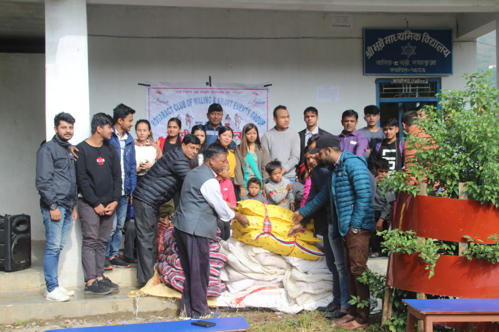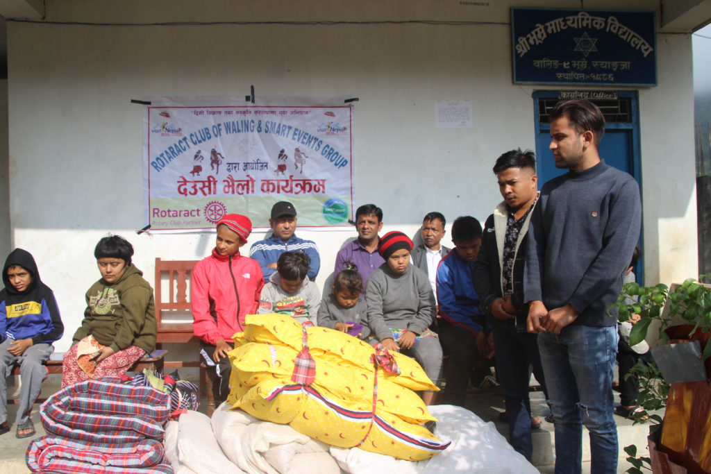 रोट्रयाक क्लब अफ वालिङ र स्मार्ट ईभेन्ट ग्रुपको संयुक्त आयोजनामा आयोजित देउँसी भैलोमा संकलन भएको रकमले भुम्रे माध्यामीक बिद्यालयमा अध्यानरत फरक क्षमता भएका छात्र छात्रालाई सिरक डस्ना बितरण गरेका छन् ।