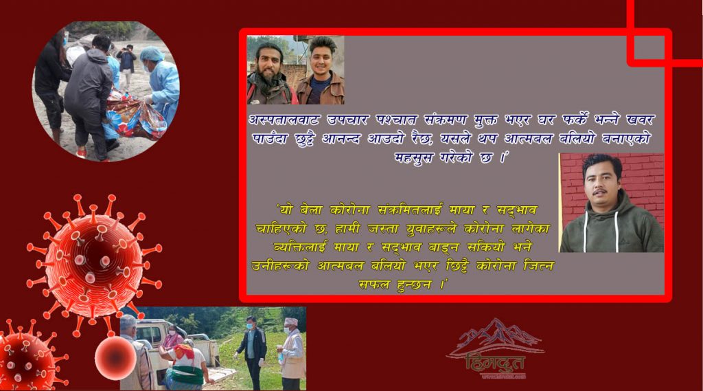 ‘कोरोना भाइरस सर्ने डरले आफ्नै परिवार र एम्बुलेन्सले समेत अस्पताल लैजान डराएपछि आफूले आत्मबल बलियो बनाएर बिरामीको सेवामा लागेको हुँ’, विवेक पराजुलीले भने, ‘गाँउवाट विरामीले समस्या परेको जानकारी प्राप्त हुनासाथ उनीहरुको उद्दार गरेका छौं । अस्पतालवाट उपचार पश्चात संक्रमण मुक्त भएर घर फर्के भन्ने खवर पाउँदा छुट्टै आनन्द आउदो रैछ, यसले थप आत्मबल बलियो बनाएको महसुस गरेको छ ।’